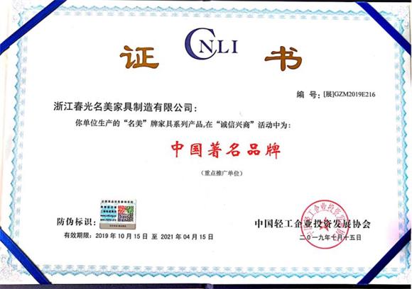 浙江春光名美家具制造有限公司 榮獲“名美”牌家具系列產(chǎn)品,在“誠(chéng)信興商”活動(dòng)中為:中國(guó)著名品牌(重點(diǎn)推廣單位)