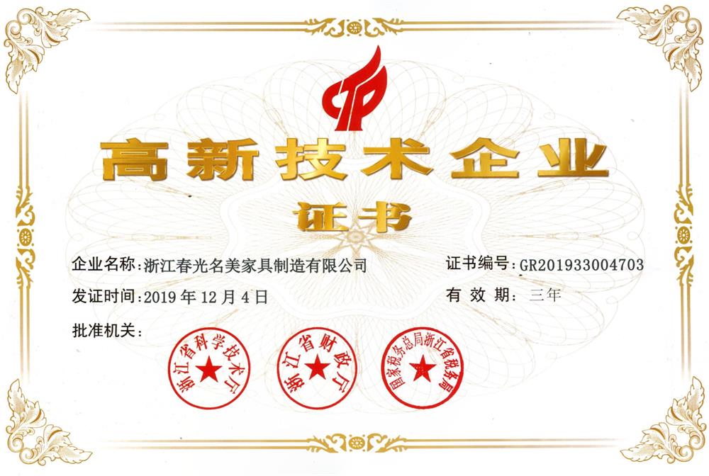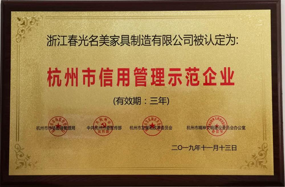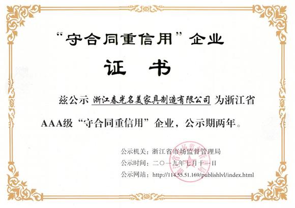 2019年7月 浙江春光名美家具制造有限公司 榮獲浙江省“守合同重信用”企業(yè)
