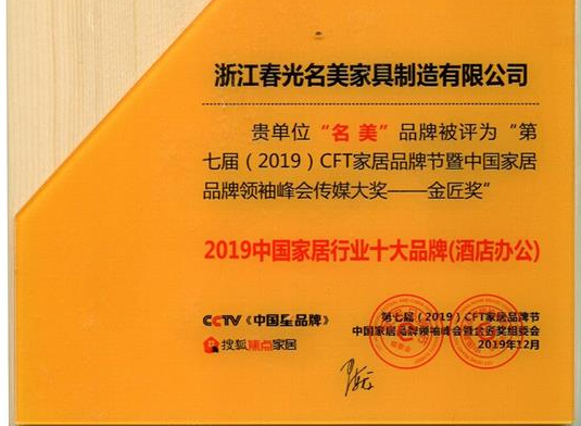 “名美”品牌被評(píng)為“第七屆(2019)CFT家居品牌節(jié)暨中國(guó)家居品牌領(lǐng)袖峰會(huì)傳媒大獎(jiǎng)——金匠獎(jiǎng)”